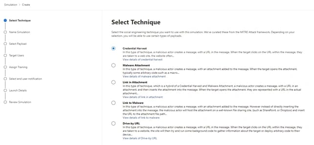 All’interno di Attack Simulation Training sono disponibili diversi tipi di tecniche di social engineering: