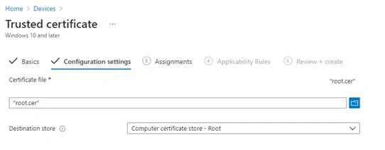 In Configuration settings importiamo il certificato root CA precedentemente salvato ed in Destination store scegliamo l’opzione: Computer certificate store – Root