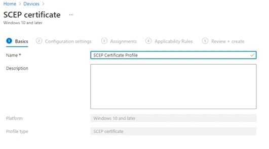 - Inseriamo in Platform: Windows 10 or later ed in Profile Type: SCEP certificate