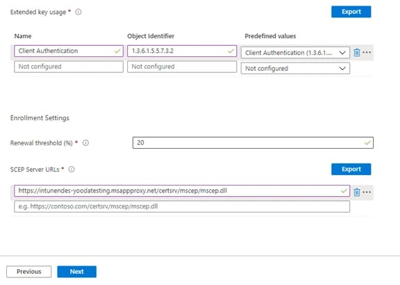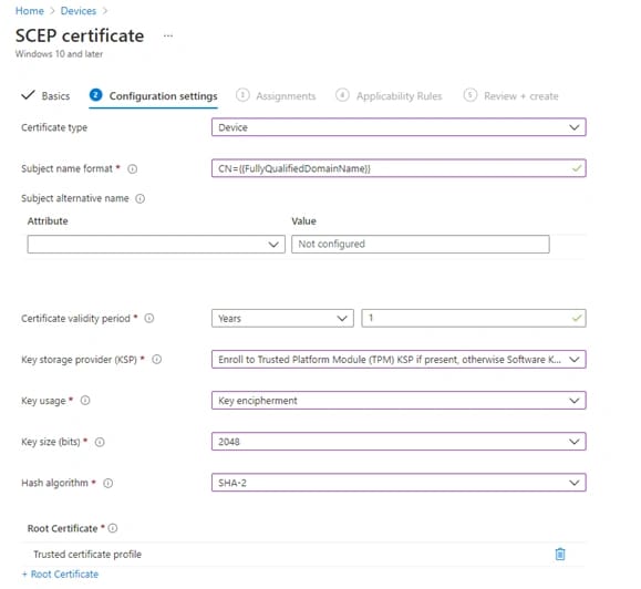 - In Configuration settings inserire la seguente configurazione facendo attenzione al campo Root Certificate, dove inseriremo il profilo creato al punto precedente e a SCEP Server URLs, dove andremo ad inserire l’URL che contiene l’FQDN pubblico che abbiamo precedentemente generato con Azure Application Proxy, il formato sarà il seguente:
