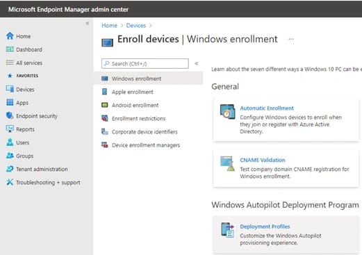 Selezionamo Devices > Enroll devices > Windows ernrollment >Windows Autopilot deployment profiles