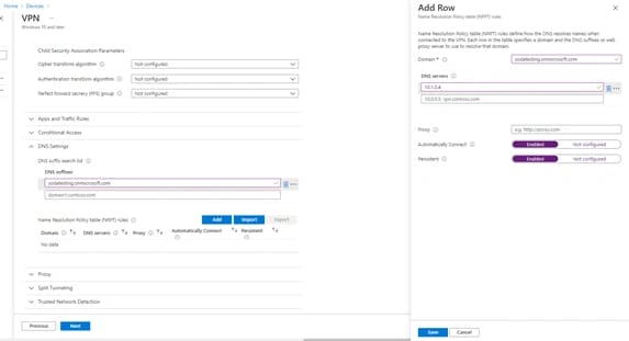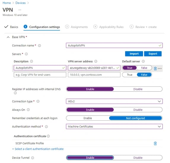 Per comodità riportiamo lo screenshot con tutte le configurazione effettuate sul profilo VPN > Configuration settings, lasciamo invece invariate le sezioni Apps and Traffic Rules e Conditional Access