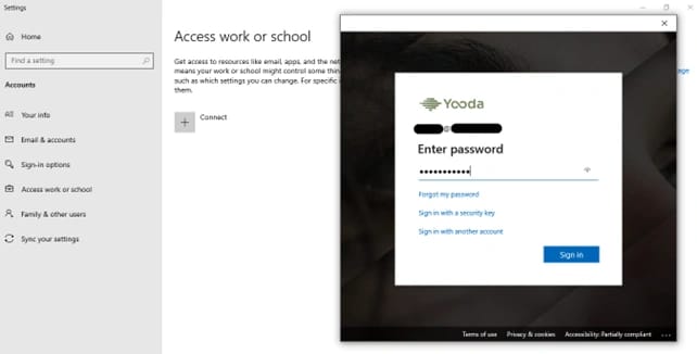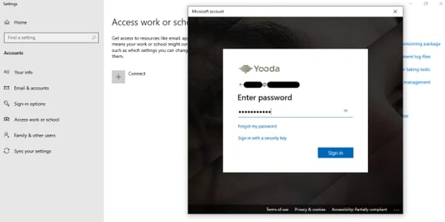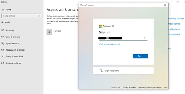 Sul nostro dispositivo personale è sufficiente cliccare su Start -> Manage your Account -> Access Work or School e seguire la procedura riportata di seguito, inserendo le credenziali del nostro utente 365.