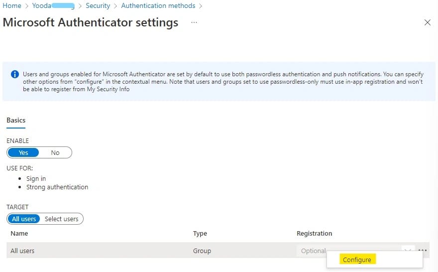 - Selezionare i 3 pallini di fianco “All Users”, oppure aggiungere il gruppo specifico con all’interno gli utenti a cui verranno abilitate le nuove feature -> Configure