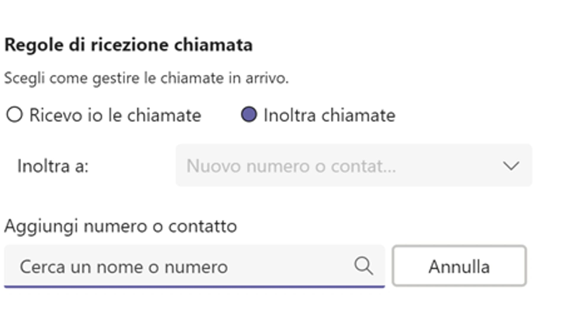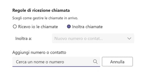 Si sceglie “Inoltra chiamate” e si inserisce il nome di un collega o un numero PSTN. In questo modo il nostro client Teams non suonerà più, ma le chiamate verranno inoltrate.