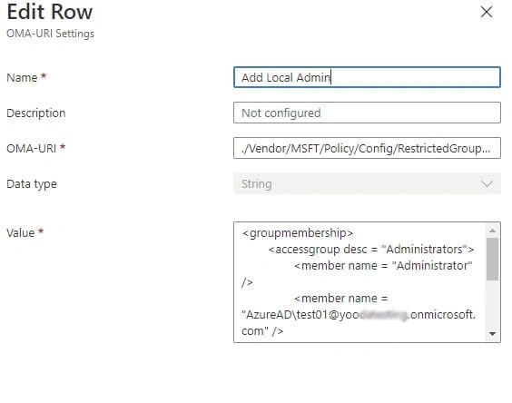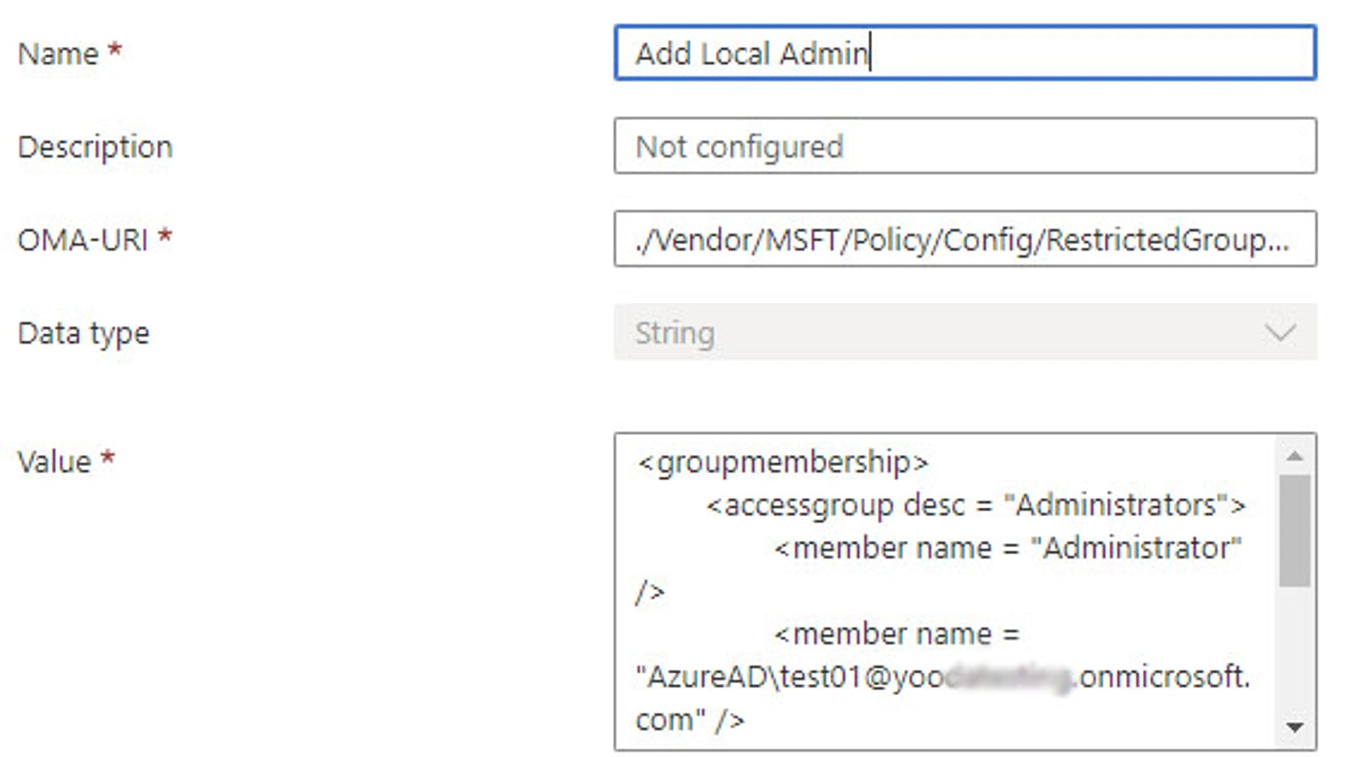 - OMA-URI ./Vendor/MSFT/Policy/Config/RestrictedGroups/ConfigureGroupMembership